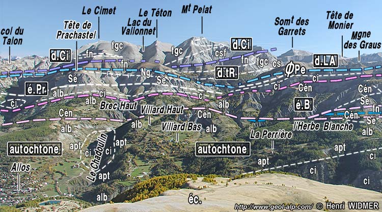 Au sud de la montagne du Pelat (environs du Lac d'Allos) ces deux digitations sont séparées de leur soubassement autochtone par une autre digitation également rapportée à la nappe du Pelat, celle du Lac d'Allos, qui disparaît vers le nord (sans doute par laminage) sous les deux précédentes. |