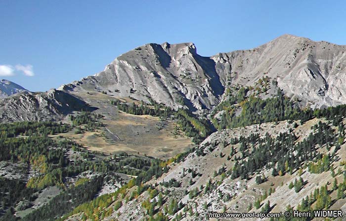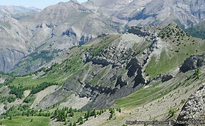 - Plus haut la crête des Graus est formée par une écaille de Prachastel : elle correspond au prolongement occidental, très effilé par biseautage tectonique, de la dalle rigide du Néocrétacé - Nummulitique dont les escarpements ceinturent plus à l'est le massif du Lac d'Allos et de l'Encombrette.