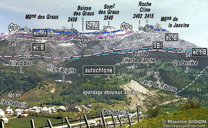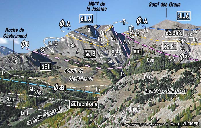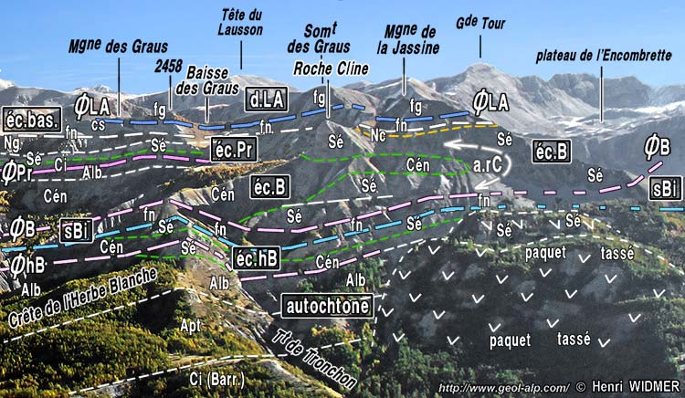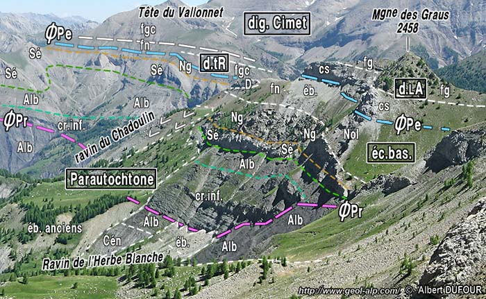 ![]() Détail du versant ouest de la montagne des Graus, vu du SW depuis la Roche Cline (cliché original obligeamment communiqué par Mr. A. Dufour). ØPr = surface de chevauchement de l'écaille parautochtone de Prachastel ; éc.bas. = "écailles basales" de la nappe du Pelat (= Nol : olistostrome du sommet de la succession autochtone) ; ØPe (en bleu) = surface de chevauchement de la nappe du Pelat ; d.LA = nappe du Pelat : digitation du Lac d'Allos ; d.tR = nappe du Pelat : digitation de Tête Ronde. ; "cr. inf." = Crétacé inférieur de l'écaille parautochtone de Prachastel, sans distinction des niveaux. |