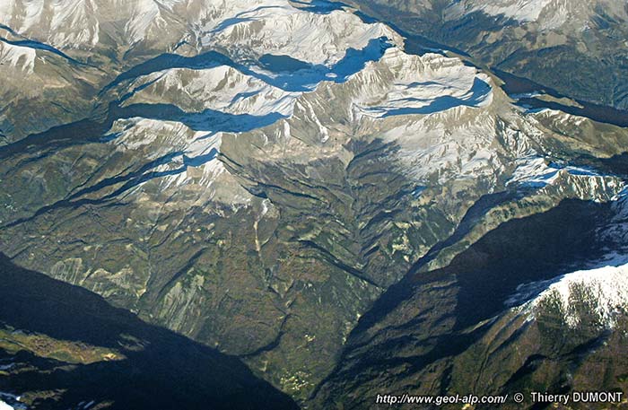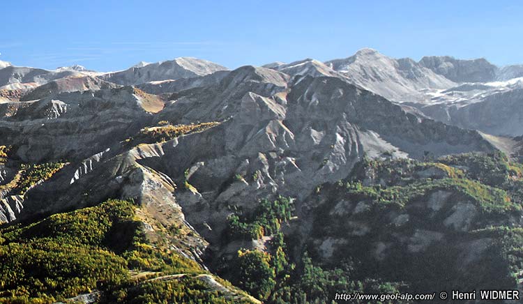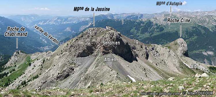 ![]() La montagne de la Jassine, vue de l'est depuis le Sommet des Graus (cliché original obligeamment communiqué par Mr. A. Dufour). On a indiqué la nature des principaux affleurements, mais sous cet angle, il est exclu de pouvoir comprendre leur organisation structurale... |
