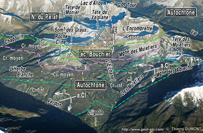 - d'abord la mise en place des charriages subbriançonnais (digitations de la nappe du Pelat et nappe de l'Autapie), qui s'avançaient originellement jusqu'à recouvrir le Crétacé moyen autochtone, dénudé de sa dalle du Sénonien -Nummulitique à l'emplacement de la haute vallée du Verdon en amont de Colmars ;