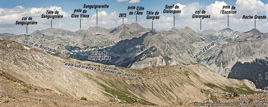 ![]() Le massif de la Sanguinière, vu de l'ouest depuis le Pas de Lausson. Paysage entièrement sculpté dans les grès d'Annot, formation dont le soubassement n'est dégagé par l'érosion de la vallée du Var qu'au delà à droite de la limite du cliché. |