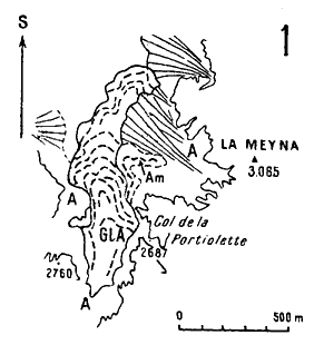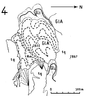 commune aux figures 1, 2, 3, 4 et 5. GlA, Rock-glaciers. Am, Moraines de névé. A, Éboulis. tq, Quartzites triasiques. tc, Calcaires triasiques. a, Andésites. |