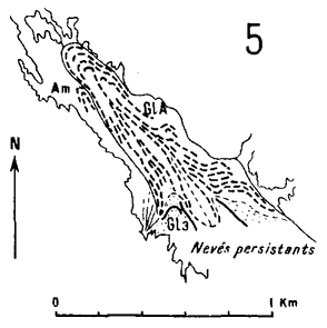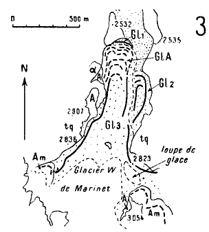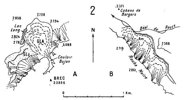 c) Enfin, je groupe ensemble (Gl2) les moraines stationnées à une altitude intermédiaire, et que la végétation a seulement commencé d'envahir (plus ou moins, suivant les points). A vrai dire, il s'agit souvent là des termes les plus récents que l'on puisse observer (au Brec, par exemple). Il est possible d'évaluer leur âge à une dizaine de siècles (très hypothétique, évidemment). Là où existe le Glaciaire « actuel », les moraines des stades Gl2, et aussi Gl1 parfois, ont été bouleversées par la crue glaciaire et ne subsistent plus qu'à titre de fragments.