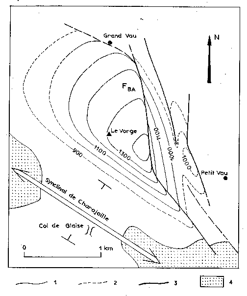 1° Une distorsion selon la direction N 120° se manifeste entre la gorge de la Maraize ( le Gouravour) et la ligne Pibonnet - La Plane, dans le flanc nord de l'anticlinal de La Plane; ce dernier se termine d'autre part, en direction du SW, par plongement de sa voûte dans le synclinal transverse de Pré-Gerbier (orienté N 120°); il s'y déplie alors entièrement, car le Tithonique, au-delà, dans les falaises du Roc de Longue Dent, possède une simple allure monoclinale. Ainsi, le synclinal de Pré-Gerbier venant raccorder entre eux les synclinaux N 75° qui encadrent l'anticlinal de La Plane ( synclinal de Tré-Maroua au Nord et de Clausonne au Sud), on aboutit à une disposition en gouttière semi-circulaire qui enveloppe complètement la terminaison périclinale de l'anticlinal de La Plane.