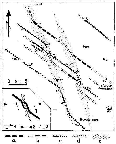 Il s'agit d'une zone allongée dans le sens NW-SE, où l'érosion a éventré les structures jusqu'au niveau des « Terres noires ». Elle ne correspond pas, toutefois, à un simple pli d'axe NW-SE : l'étude des flancs de cette structure montre en effet une disposition très composite qui doit être interprétée comme le résultat de la déformation d'un ancien anticlinal d'axe N 75 (1). Ce pli s'observe effectivement entre la crête de Maragache et le Château de Châtillon-le-Désert, point où sa voûte est tronquée et scellée par la transgression oligocène (ce qui prouve ]'ancienneté du pli ). Vers le SW, les flancs tithoniques du pli s'écartent à partir de la crête de Maragache pour prendre une direction sensiblement N 120°, s'alignant ainsi sur un axe anticlinal perceptible au niveau des « Terres noires » à Espréaux même. En outre, les flancs de cette structure se redressent à plusieurs reprises, suivant la direction N 160°, contre des plans de cassure de même direction, au prix de flexures synclinales brutales à fort plongement nord. En certains points la cassure ne se produit pas complètement et se trouve remplacée par une simple flexure anticlinale de même signification Ces accidents traduisent certainement une compression tardive par rapport à la fracturation. En effet, la disposition des crochons le long des plans de fracture indique un déplacement senestre (fig. 3), qui ne peut rendre compte des flexures synclinales.