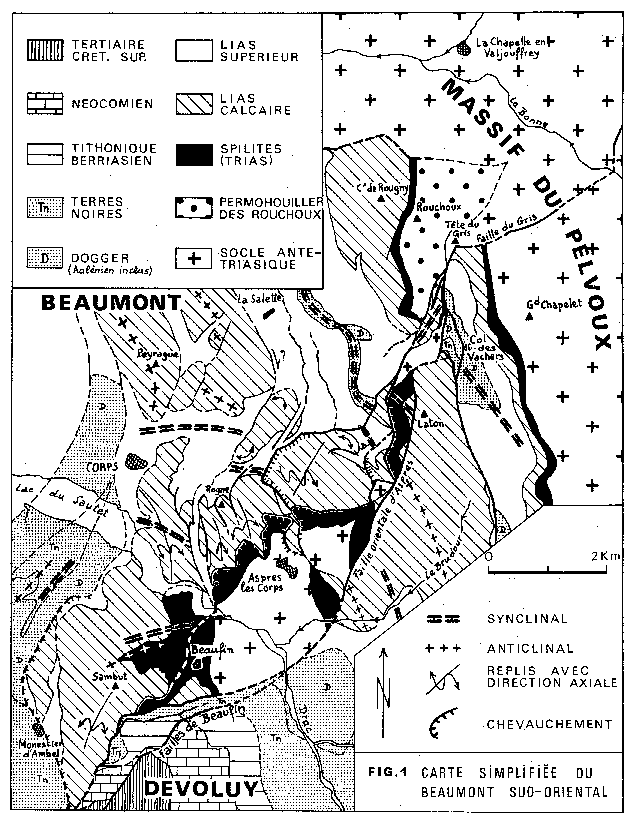 Les recherches que nous poursuivons sur le chevauchement de Digne nous ont conduits à suivre cette structure vers le Nord au travers du Dévoluy et à en chercher l'enracinement septentrional dans la région de Corps, au Nord du Drac (4): précisément. les crêtes séparant le Champsaur du Beaumont (1) au Nord d'Aspres-les-Corps, sont caractérisées par la présence d'un chapelet d'affleurements de socle qui traverse du Nord-Ouest au Sud-Est la couverture mésozoïque du massif cristallin du Pelvoux pour se raccorder à l'extrémité Nord-Est du massif du Dévoluy. Dans un important article J. Goguel (9) a attribué à cet alignement la valeur d'un décrochement dextre majeur qui prolongerait vers le Sud l'accident du Chambon et du col de La Muzelle. Alors que F. Bartoli, A. Pécher et P. Vialon (3) confirment l'existence de ce décrochement au col de La Muzelle, J. Vernet (10), au contraire, voit dans les « écailles flottantes » d'Aspres le résultat d'une « tectonique d'éjection » verticale aux dépens d'un « axe anticlinal profond ». Enfin J. Aprahamian (2) met en évidence de part et d'autre de cet alignement de socle, aux abords d'Aspres, des différences dans la cristallinité de l'illite qui peuvent traduire un décalage qui serait alors sénestre.