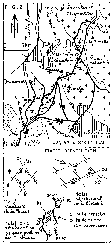 En conclusion, si l'on tient compte de ces divers éléments et du contexte structural reconnu dans les régions avoisinantes, il paraît satisfaisant d'envisager un déroulement des événements (fig. 2) qui comporte: (a) une phase nummulitique, créant, par une compression proche de Nord-Sud, une mosaïque de « coins », délimités par des failles conjuguées; (b) une phase tardive (néogène ?), de serrage Est-Ouest, qui déforme cette mosaïque: certaines portions des failles sénestres rejouent alors dans un mouvement dextre, d'orientation peu différente; en même temps les compartiments pris entre les failles (dextres) N 160 s'écrasent et développent des plis subméridiens, tandis que certaines de ces failles, notamment à la limite cristallin-sédimentaire, subissent une torsion de leur plan qui bascule vers l'Ouest; ainsi apparaît, dès le secteur du Valjouffrey (versant ouest du Pic de Valsenestre) mais surtout au Nord-Ouest d'Aspres, la tendance au chevauchement vers l'Ouest qui s'amplifie progressivement du Nord au Sud, à partir du Dévoluy, pour aboutir au chevauchement de Digne.