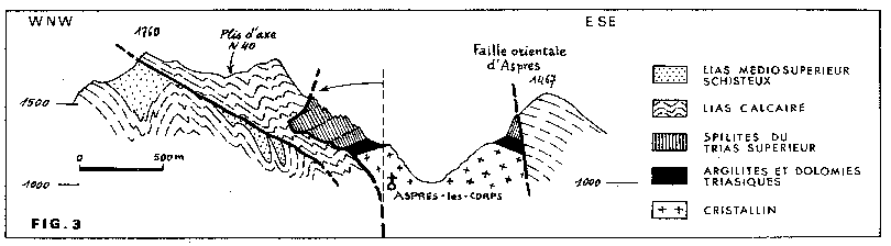 (b) D'autres faits, par contre, prouvent un rejet sénestre décakilométrique: 1° L'étude de l'extrémité Nord-Est du Dévoluy, à l'Est de Monestier-d'Ambel montre clairement, compte tenu des pendages des couches et du sens des crochons, que le décalage le long du faisceau des failles de Beaufin ne saurait être que sénestre. Nous avons d'ailleurs pu montrer (8) par l'analyse des modalités de ce décrochement, à l'intérieur même du Dévoluy qu'il a joué au cours du Nummulitique avant d'être sectionné et « transporté » par un chevauchement (vers l'Ouest) plus tardif; 2° Les crochons affectant les plans des failles N 170 que nous avons observés à l'Ouest du col des Vachers témoignent également d'un jeu sénestre de la faille orientale d'Aspres; ce mouvement se traduit d'ailleurs par le décalage vers le Nord, le long de cet accident, de la voûte anticlinoriale du Lias calcaire du torrent du Brudour par rapport à celle de la Tête de Sambut (dont le cristallin d'Aspres-Beaufin ne représente très vraisemblablement que le coeur). Ce rejet sénestre fournit également une explication satisfaisante au décalage des lignes d'isocristallinité de l'illite. Or le chevauchement du cristallin sur le Lias médio-supérieur, au Nord d'Aspres-les-Corps, présente une disposition (fig. 3 ) qui ne laisse guère de doute sur sa genèse par basculement vers l'Ouest d'un plan de faille préexistant: il est dès lors logique de considérer, comme en Dévoluy, que la phase des mouvements Nord-Sud sénestres est celle qui a produit la fracturation précoce dans ce dispositif, tandis que les mouvements dextres qui ont transformé les failles en chevauchements sont plus tardifs.