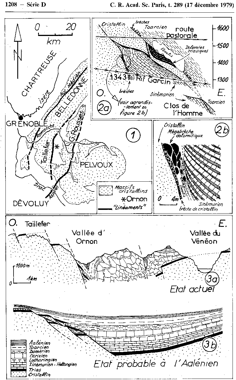 De fait, qu'il s'agisse d'une faille, d'une flexure, ou d'une combinaison des deux, cet accident du col d'Ornon existe bien, mais il s agit d'une structure nettement plus ancienne, synsédimentaire, qui a fonctionné à plusieurs reprises au cours du Lias et qui a prédéterminé, dès cette époque, l'important abrupt par lequel le massif cristallin du Taillefer domine maintenant la dépression structurale de Bourg d'Oisans-col d'Ornon (fig. 3).