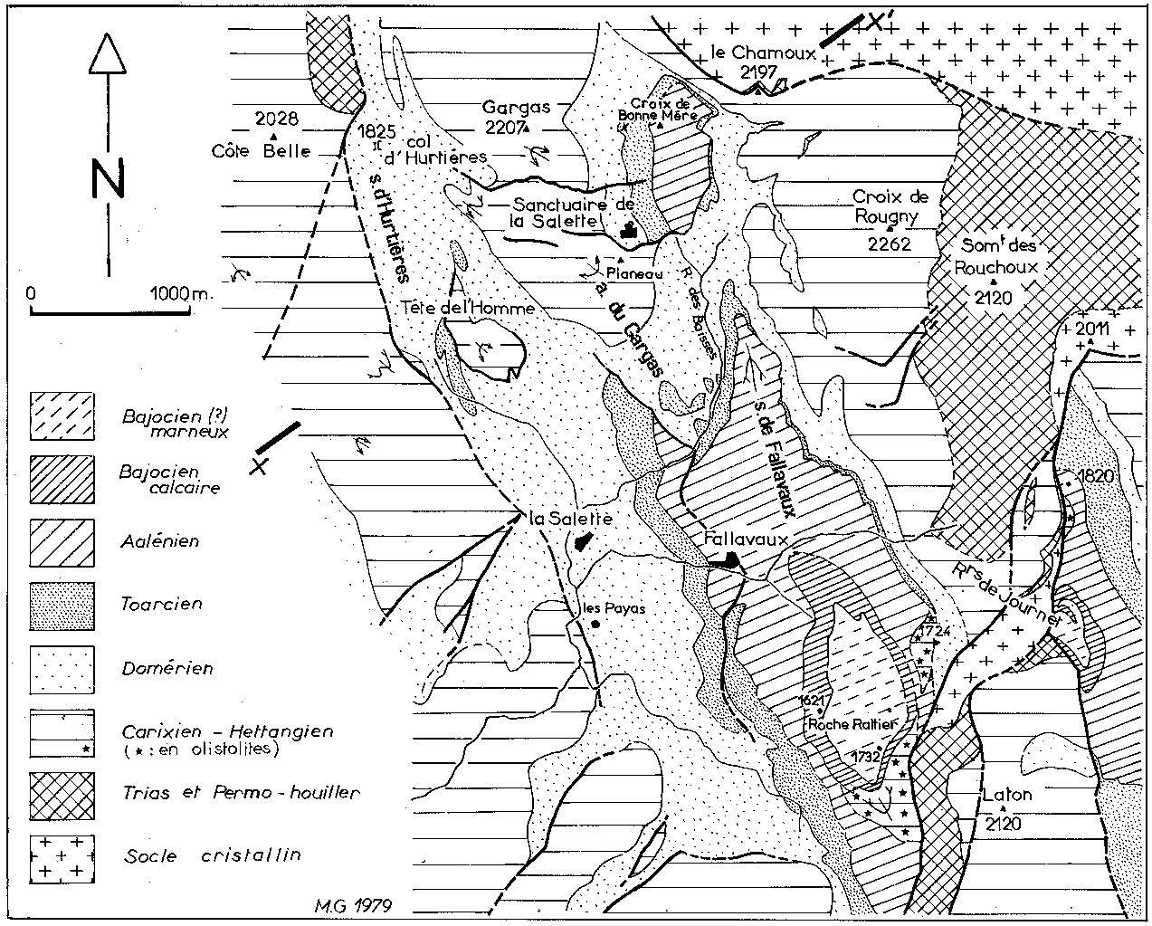 FIG. 2.-Carte de la dépression structurale de la Salette (quaternaire non représenté). X...X': tracé approximatif de la coupe de la figure 3a. Le synclinal de Fallavaux est délimité à l'ouest par le Lias calvaire de Cote Belle et, à l'est, par celui de la Croix de Rougny; il est accidenté, à Fallavaux même par une faille inverse redoublant le Toarcien et l'Aalénien. Plus au Nord, au Gargas il est compliqué par des replis, d'axe N 120-N 140, dont les charnières ont été indiquées. On a figuré de même les charnières du chaînon de Côte Belle.