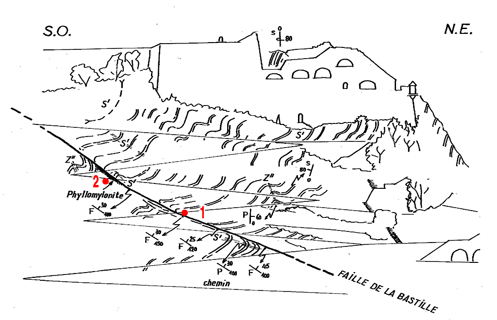 Quelques mesures de pendage ont également été indiquées elles concernent soit des strates (s) soit des pans axiaux de plis (P) soit encore la surface de chevauchement de la faille de la Bastille (F). L'ensemble des couches pend fortement et se renverse même dans la partie masquée par les remparts (bancs sud-ouest de l'anticlinal de la Bastille).