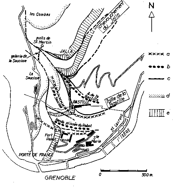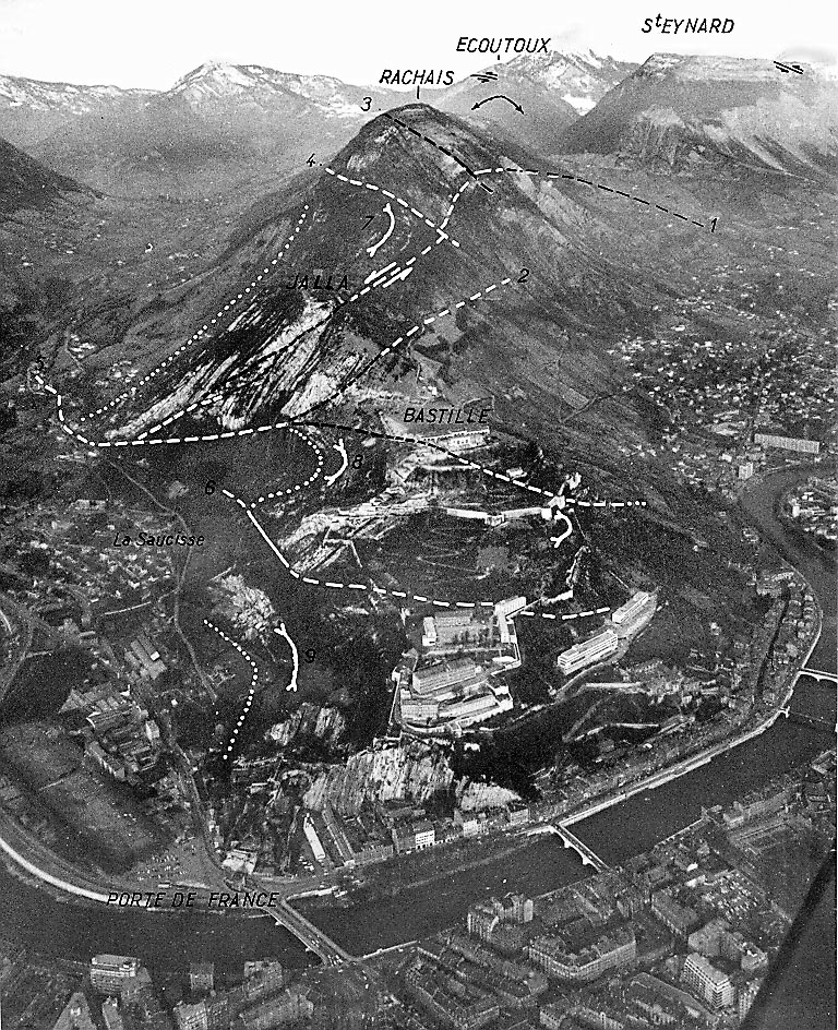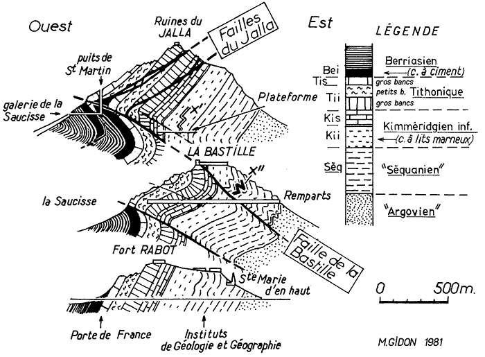 La mieux individualisée, et celle qui semble avoir le rejet le plus important, est la faille de la Bastille. Elle ne coïncide dans son tracé qu'avec la partie la plus méridionale de l'accident décrit sous ce nom par les auteurs précédents [6] et, vers le Nord, s'identifie avec leur « décrochement du Jalla » à partir de la plate-forme de la Bastille; le raccord entre ces deux tronçons découle clairement de la cartographie mais se trouve toutefois masqué, sur 200 m de long par les fortifications et la gare du téléphérique.
