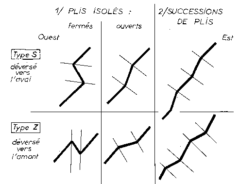 - les plis les plus accusés (fermés à près de 90° ou même aigus) ont un flanc court penté en sens opposé du reste des assises de la montagne. Par rapport à ces dernières le plan axial peut être déversé vers l'aval (type S) ou vers l'amont (type Z); il peut, de plus avoir des azimuts assez différents (types S' et S") et une inclinaison variable (types Z' et Z");