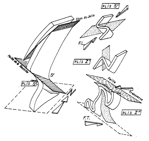 3) Plus tard encore apparaissent les chevauchements vers le Sud-Ouest, grossièrement transversaux aux flancs des grands plis, et les torsions qu'ils induisent (plis S').