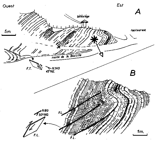 Fig. 8. - Les plis de la plate-forme de la Bastille (croquis d'après nature; A = coupe d'ensemble; B = détail du pli S du secteur désigné par un astérisque).