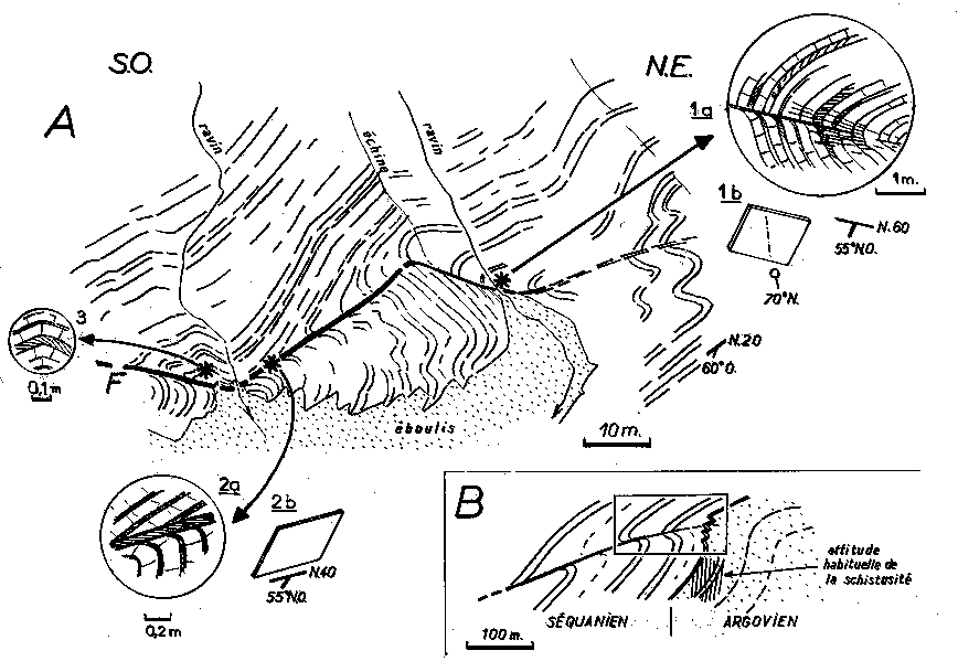 2. la disposition de la schistosité, au voisinage de ces failles et du plan axial des charnières : il n'y a pas superposition mais torsion par rapport à la schistosité exprimée dans la partie supérieure gauche de l'affleurement représenté en B.