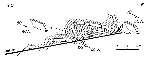 A l'échelle décamétrique et métrique peu de plis de ce type ont été rencontrés; ceci est sans doute dû à ce qu'ils interfèrent alors avec les autres types de plis en donnant des zones d'ondulations mal analysables: tel semble être le cas dans le soubassement des remparts SE de la Bastille où s'associent effectivement plis en S et plis en Z (fig. 7).