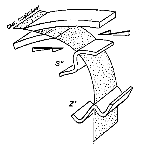 3) Un cisaillement plus oblique aux couches est à l'origine des failles chevauchantes transverses et des plis S'; il semble responsable également de la création des plis Z" par déformation des Z'. C'est une déformation plus tardive que les deux autres.