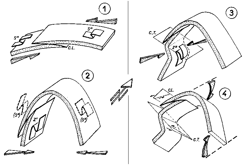 2) Un stade ultérieur du serrage amène la fermeture progressive des plis d'ampleur kilométrique et s'accompagne de la formation, sur leurs flancs, de plis parasites (type Z'); les structures antérieurement formées sont donc tordues (ou basculées, dans le cas des petits plis).