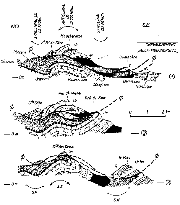 Les replis d'entraînement associés au chevauchement Corenc - Jalla (Ø) ont été symbolisés en trait gras.