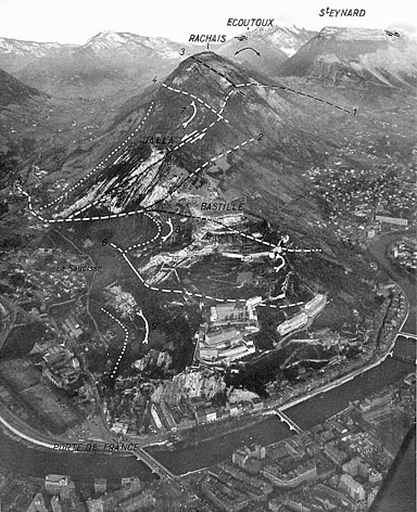 Le massif de la Chartreuse se termine vers le Sud par le promontoire du chainon du Mont Rachais, du Mont Jalla et de la Bastille qui s'abaisse jusqu'à l'Isère à la Porte de France. Cette échine rocheuse, dont l'ossature est constituée par la barre des calcaires tithoniques, plonge, monoclinalement dans son ensemble, en moyenne de 45° vers l'W-NW; elle représente le flanc ouest d'un pli de dimensions plurikilométriques, orienté sensiblement N-S et nettement plongeant vers le Nord, l'anticlinal de l'Écoutoux (fig. 1 et 2).