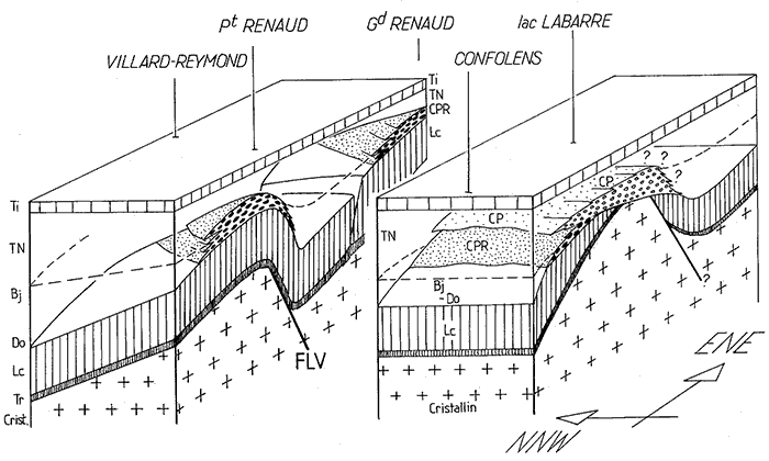 Il y avait donc, dès le Jurassique, une paléopente orientée SW-NE séparant une zone haute méridionale, que les Terres Noires elles-mêmes n'ont que difficilement recouvert, d'une zone déprimée septentrionale. C'est à cette circonstance que le synclinal de Villard-Reymond doit surtout de se terminer vers le Sud et de ne plus se dessiner dans le soubassement du Grand Renaud. Sa remontée axiale vers le Sud correspond, en fait, surtout à un basculement de la surface du socle qui est intervenu dès la fin du dépôt du Lias calcaire, et peu à un mouvement tardif par rapport à la formation du synclinal.