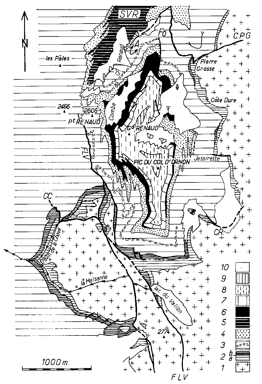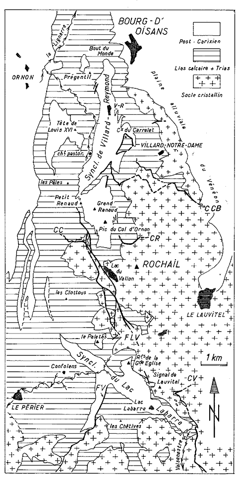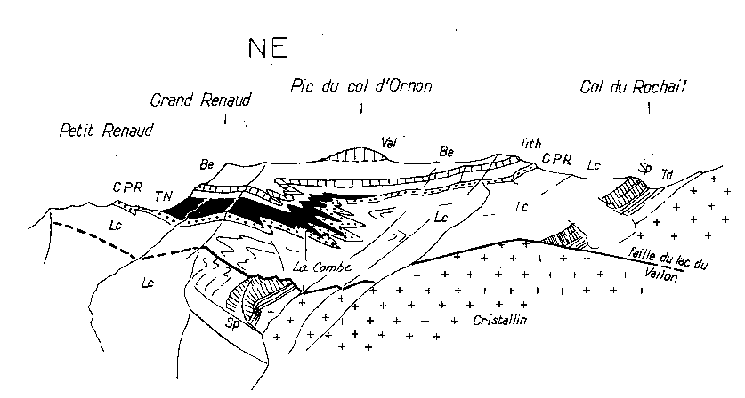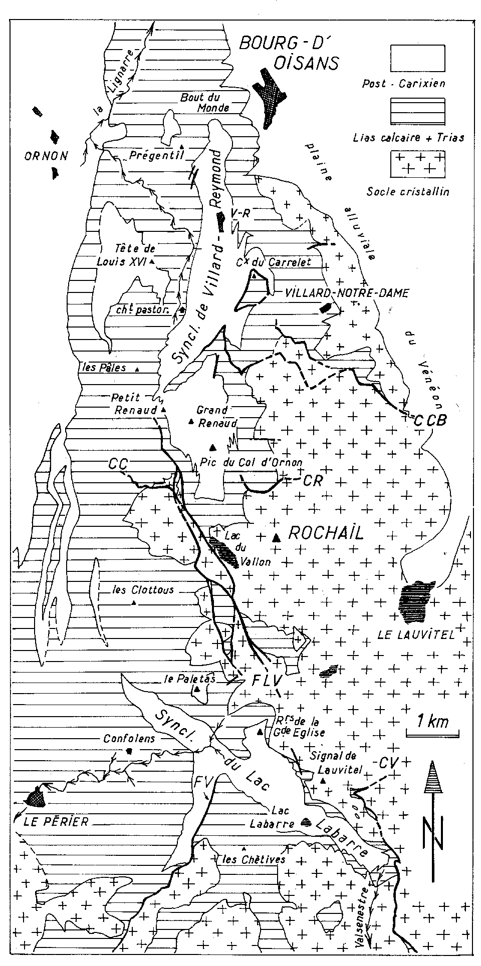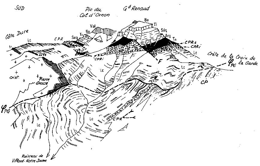 I) On constate, grâce au soulèvement axial des structures vers le Sud, que au niveau du Petit Renaud, donc dans le prolongement exact du flanc ouest du synclinal de Villard-Reymond, le socle est précisément dénivelé, dans le sens voulu, par les failles du Lac du Vallon.