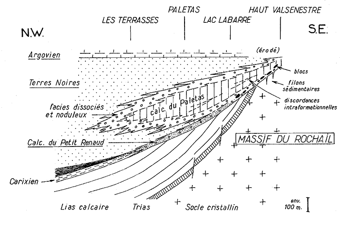 En définitive, ces deux formations appartiennent donc vraisemblablement à un seul corps sédimentaire calcaire développé sur les hautes pentes de bordure d'un bassin à sédimentation marneuse. Ce corps sédimentaire dont les limites inférieure et supérieure sont probablement diachrones s'est édifié depuis le Carixien, et jusqu'à l'Oxfordien au moins, sur les pentes nord-occidentales de l'actuel massif du Rochail (fig. 14). Du Carixien jusqu'au Bajocien inclus il ne représentait qu'un enduit, totalisant quelques dizaines de mètres d'épaisseur, que nous avons appelé la formation du Petit Renaud. A l'Oxfordien, une sédimentation calcaire fine plus abondante a permis transitoirement à ce corps sédimentaire de s'étendre vers l'Ouest en empiétant sur le domaine de sédimentation des Terres Noires: c'est notre formation du Paletas qui ne représente en somme qu'une apophyse latérale de cette construction sédimentaire carbonatée.