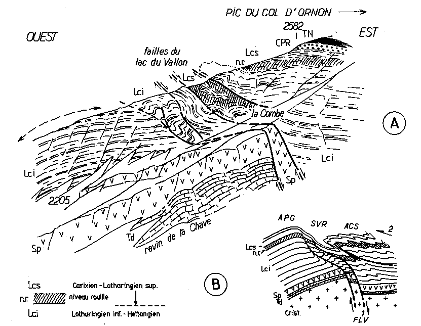 En définitive, on rencontre une grande variété d'accidents de socle: les failles chevauchantes témoignent de mouvements diversement dirigés, ce qui tend à confirmer que les déformations de ce secteur résultent de plusieurs phases de serrage selon des directions distinctes (variant de N-S à E-W). Les failles les plus importantes (failles du lac du Vallon) montrent des indices portant à envisager qu'elles ont eu un fonctionnement précoce (peut être dès le Lias puisqu'elles paraissent s'y amortir), avant de rejouer lors de ces serrages.