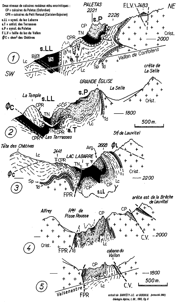 2) Une importante diminution d'épaisseur affecte d'Ouest en Est le Lias calcaire du flanc SW du synclinal du lac Labarre à partir de la crête des Chétives; elle atteint son maximum sur le versant Valsenestre aux abords du thalweg du ruisseau de Pisse Rousse [notons également qu'ici les bancs liasiques reposent en discordance, par une surface de corrosion, sur les spilites triasiques]. Or, c'est sur la même transversale du synclinal mais sur l'autre flanc que le Lias disparaît totalement, de façon passagère, sur l'arête SSE du Signal de Lauvitel (cf. plus haut). La surface du cristallin dessinait donc là une voûte antiforme, orientée NE-SW et transverse aux structures actuelles. Peut être celle-ci se poursuivait-elle en direction de la Brèche de Lauvitel (dont les affleurements liasiques représenteraient la retombée NW de cette structure).