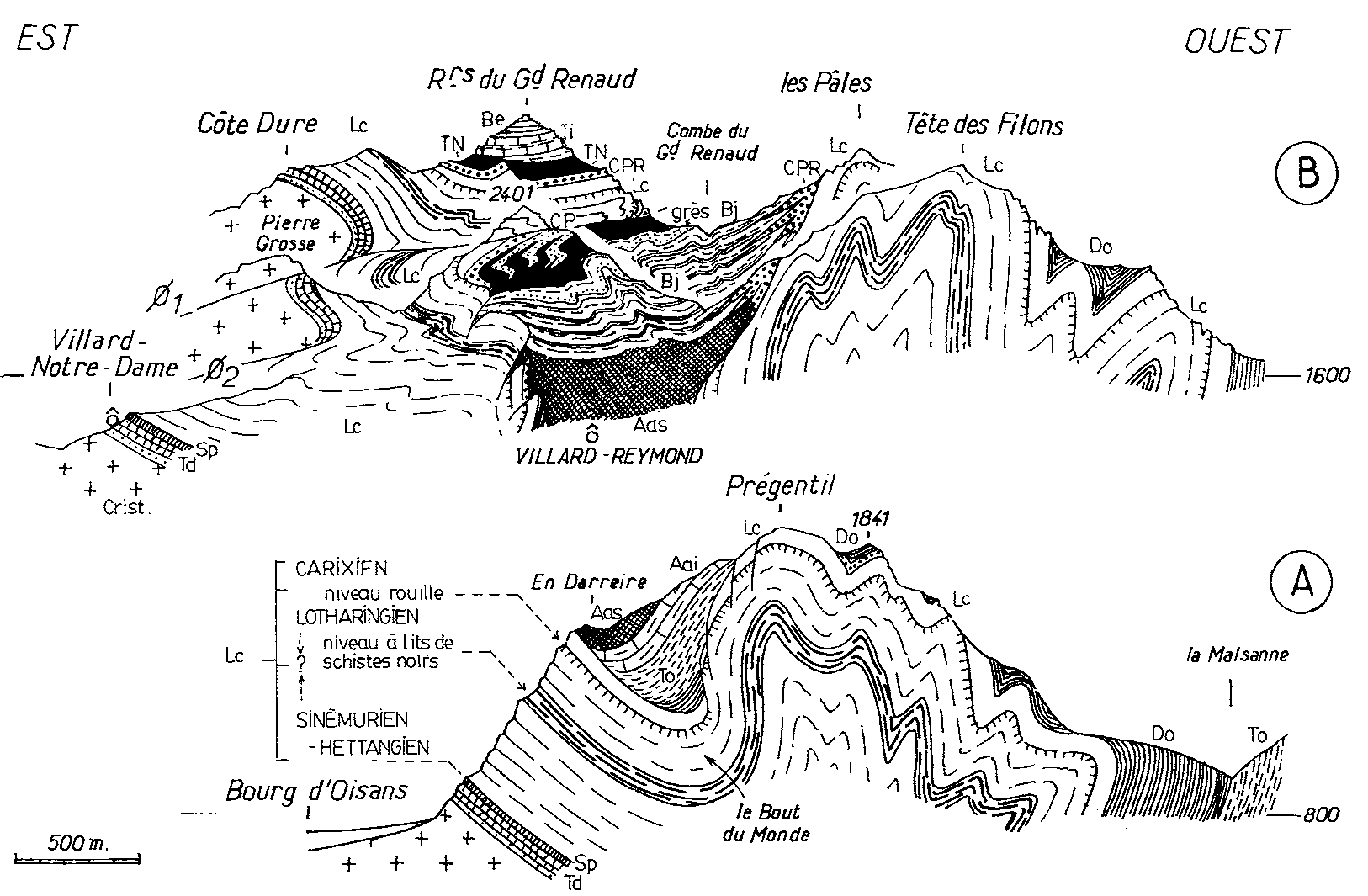 A l'aplomb du Grand Renaud la surface du cristallin du Rochail s'abaisse rapidement de plus de 1 000 m, vers le NW avant de reprendre une pente plus modeste au Nord de Villard-Notre-dame. C'est sur cette brutale inflexion que se greffent les chevauchements de Côte-Belle et, dans la couverture, les plis de l'arête N du Grand Renaud. Or, il existe des arguments très forts pour penser que ces accidents n'ont fait que reprendre une structure qui préexistait depuis le Jurassique. En effet, ils se situent à la frontière entre deux domaines caractérisés par des successions stratigraphiques différentes: