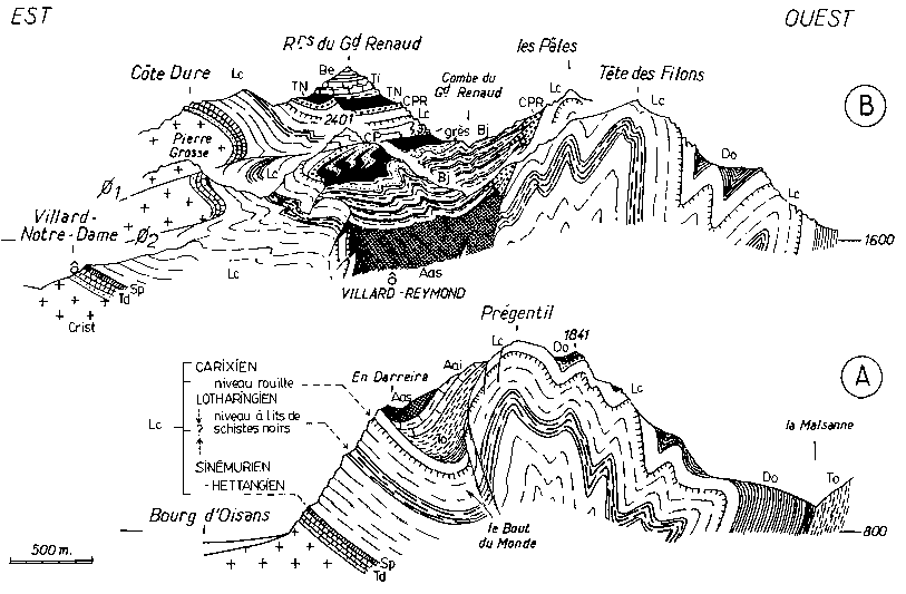 Les multiples plis du Mésozoïque du synclinal de Bourg-d'Oisans ont déjà fait l'objet d'études détaillées (GRATIER, 1973; GRATIER et VIALON, 1979). Il importe pour notre propos de souligner que ces anticlinaux et synclinaux, de longueur d'onde et d'amplitude déca- à hectométrique, s'organisent en plis d'ordre supérieur, kilométriques, dont l'individualité se manifeste notamment à la lecture des cartes géologiques (fig. 2).