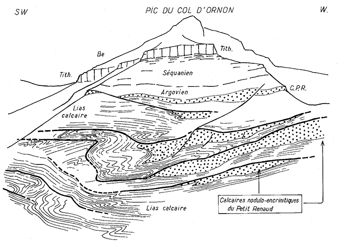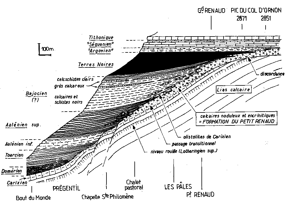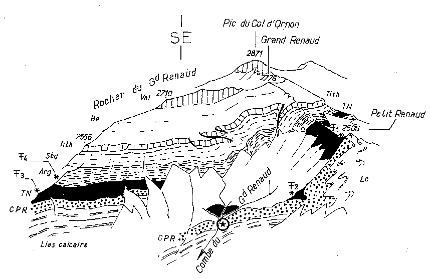 Les couches plus élevées, qui forment un ressaut marqué et affleurent au Nord du sommet du Grand Renaud (point 2 710) ainsi qu'au Pic du col d'Ornon, sont des calcaires gréso-argileux bruns souvent mal lités. Ce faciès est sans aucun rapport avec les calcaires bioclastiques du Sud du Vercors et du Nord du Dévoluy auxquels J.