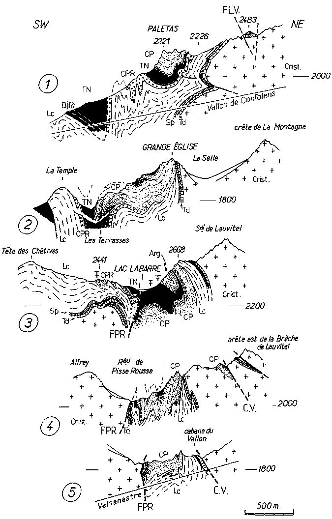 2) Le synclinal du lac Labarre (fig. 6), d'orientation N 120, relaye vers le SW celui du Villard-Reymond car il naît là où le précédent s'efface. Simple repli dans le versant ouest des sommets des Pâles et des Clottous, il s'individualise nettement, plus au Sud, dès le ravin d'lssard (près de Confolens). Entre le lac Labarre et le vallon de Valsenestre, il prend l'aspect d'un véritable fossé sédimentaire pris entre les deux masses de cristallin du Signal de Lauvitel (au NE) et de l'Arcanier (au SW). En rive gauche du vallon de Valsenestre enfin, il bute contre le chevauchement de Valsenestre. Sa structure interne, simple au Nord de Confolens, se complique vers le SE par apparition de replis multiples. Sur le flanc NE de ce synclinal, le contact sédimentaire/cristallin est stratigraphique, même si localement, dans les pentes séparant le lac Labarre du Signal de Lauvitel, ce contact est renversé et cisaillé tangentiellement. Le flanc SW, très redressé, est affecté, au contact du cristallin par une faille à rejet stratigraphique normal, passant localement à un. chevauchement vers le NE.