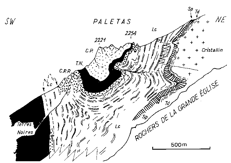 1) Dans tout le versant SE de la crête qui descend vers le Sud depuis la Brèche de Lauvitel, les calcaires du Paletas reposent directement sur le cristallin. Pourtant au sommet de la crête, à la brèche même, existe un affleurement de Trias et de Lias; cela indique que la surface du socle s'infléchissait assez brutalement (vers le NW ou vers le NE) pour que ces terrains aient été soustraits à l'érosion préludant au dépôt des calcaires du Paletas. Il ne semble pas qu'une faille en soit responsable, mais les témoins de terrains sédimentaires sont trop rares ici pour que l'on puisse préciser la géométrie de l'agencement des couches.