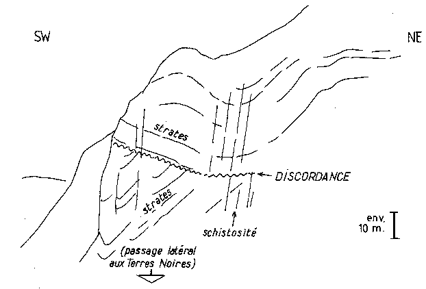 Les Terres Noires par contre ne se distinguent pratiquement pas des schistes aaléniens par leur faciès et reposent parfois directement, sans intercalation de schistes du Lias ou du Dogger, sur les formations calcaires inférieures, globalement rapportées jusqu'à maintenant au Lias calcaire. Leur première caractérisation (BARFÉTY et GIDON, 1982) résulte des récoltes paléontologiques et, en l'absence de tels arguments, un doute subsiste encore sur l'âge des schistes noirs du coeur de certains replis synclinaux.