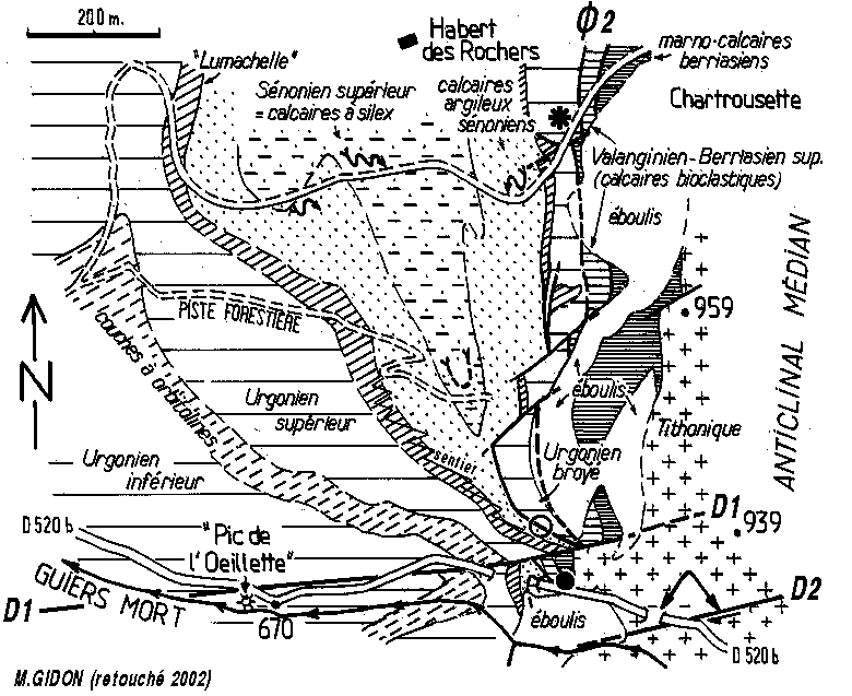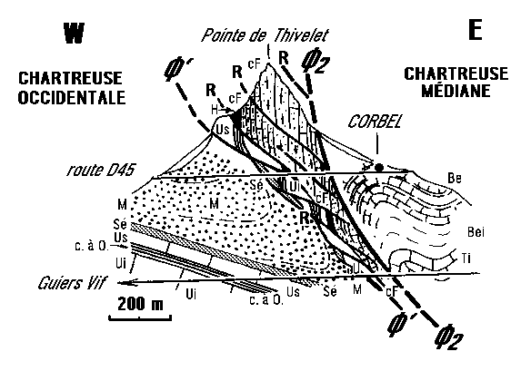 Noter aussi la charnière synclinale du Sénonien du col de Mauvernay et surtout la manière dont le chevauchement chartreux oriental (Ø3) perd son individualité en se partageant entre les multiples fractures qui débitent la lame d'Urgonien (seules les plus importantes sont représentées).