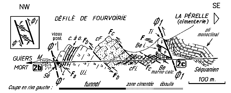 - A partir d'une centaine de mètres au dessus du lit du Guiers le compartiment chevauchant se montre alors affecté d'une belle voûte anticlinale, l' Anticlinal de Fourvoirie, caractérisé notamment par son dessin très arrondi et ouvert. dépourvu de déversement : il a donc une forme sensiblement différente de celle du crochon observable au niveau du Guiers (fig. 2). Il est remarquable que le flanc W de cet anticlinal, incliné à environ 50° W, à peu prés comme les couches des lames tectoniques du fond de la gorge, est simplement tranché par le chevauchement.