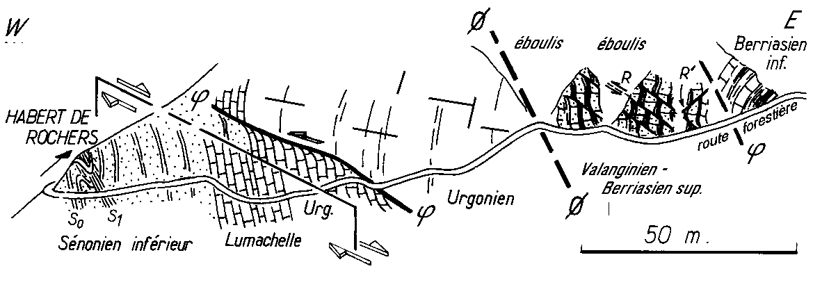 - A l'W de la lame d'Urgonien (dont la structure est d'ailleurs affectée d'autres complications de détail à plusieurs niveaux), la disposition évolue de bas en haut. Vers le bas (jusqu'à 100 m. au dessus du niveau de la route), le contact avec le Sénonien inférieur du compartiment chevauché est franchement tectonique (fig.7).