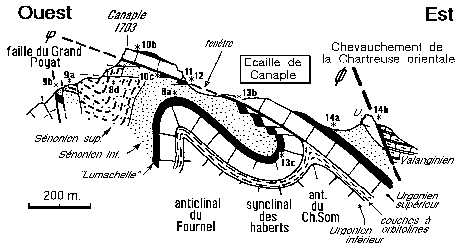 Noter spécialement le sectionnement, par la surface basale de l'écaille de Canaple, des accidents secondaires de l'anticlinal médian (synclinal du Habert de Charmant Som, anticlinal du Fournel et faille du Grand Poyat).