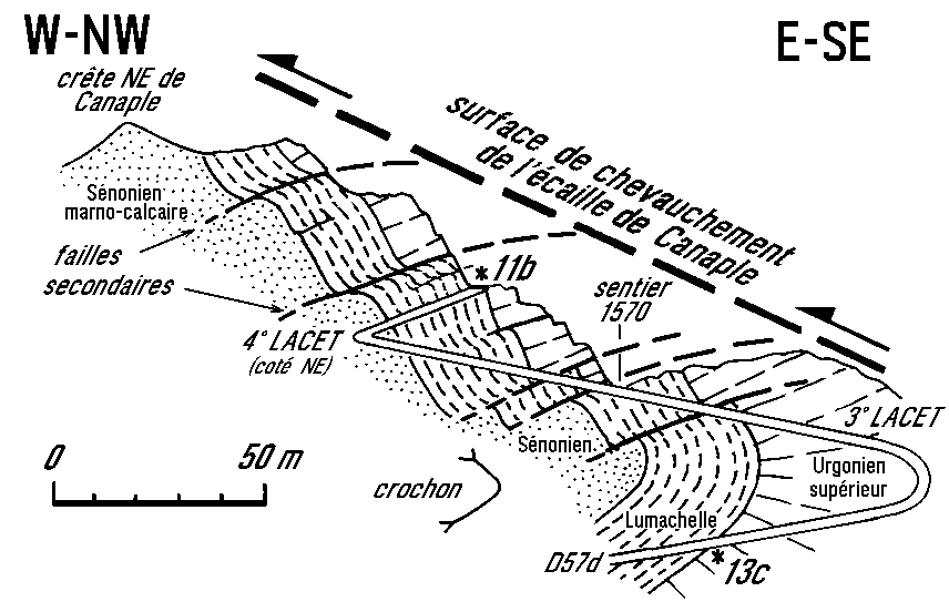 Le tracé de la route permet de recouper plusieurs des multiples failles plates. A l'emplacement de la coupe, l'écaille de Canaple est enlevée par l'érosion; mais immédiatement au SW du lacet occidental elle est conservée (car abaissée par une faille transverse) : on constate alors fort bien que ces failles plates se branchent sur sa surface basale de l'écaille, elle même affectée, d'ailleurs, de décalages métriques par de telles cassures.