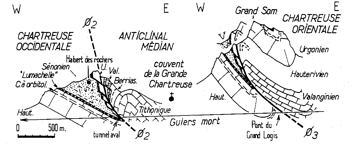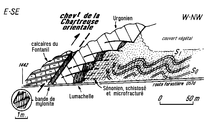 - Le chevauchement de la Chartreuse orientale, qui poursuit vers le S celui du front des Bauges [GIDON,1964] et passe, au delà de la Cluse de l'Isère à celui du Moucherotte [DEBELMAS,1965 et 1966] [GIDON 1981].