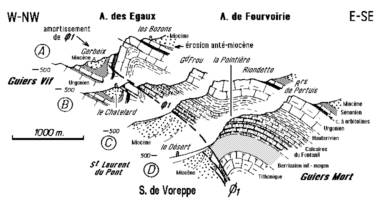 A- correspond au secteur d'amortissement dans l'anticlinal des Egaux, au N du Guiers Vif.
