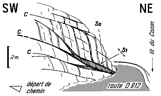 L'intense débitage des couches par des failles inverses à faible pendage E fait que la stratification, très redressée, n'est bien visible que dans les tronçons les plus épais; elle n'est pratiquement plus perceptible dans les lames dont l'épaisseur est inférieure à un mètre. Cette structure mésoscopique relève du type dit S/C car une schistosité (S1), subparallèle à la stratification (So), est également recoupée par les fractures cisaillantes (C). Cette schistosité est d'ailleurs mieux développée dans les zones de connexion de ces fractures.