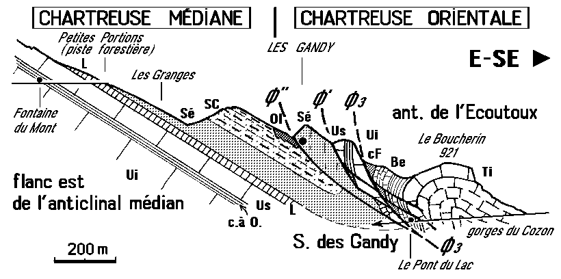 Fig.18 : Coupe synthétique du chevauchement chartreux oriental, entre les gorges du Cozon et le village des Gandys.