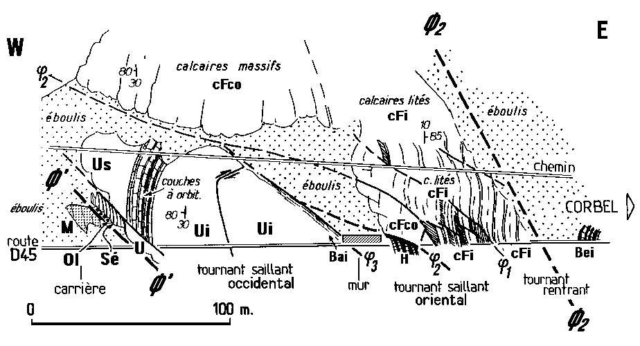 Noter l'opposition entre la charnière anticlinale régulière observable à Corbel et le cou loir de tectonisation - composé de tronçons juxtaposés - qui matérialise, plus à l'W, la zone de cisaillement du chevauchement médian (Ø2).