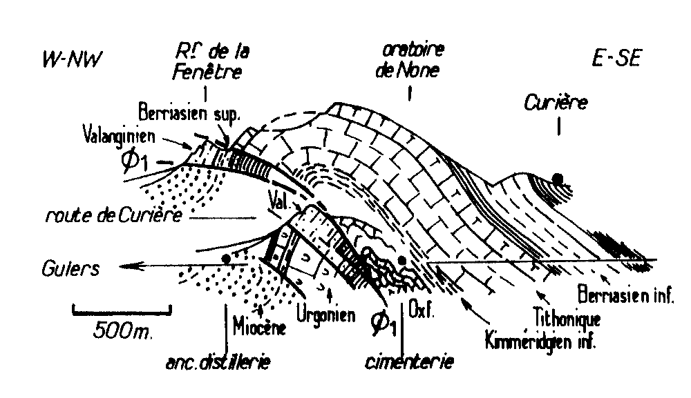 Les chevauchements n'émergent pas au niveau de la surface topographique à l'occasion d'une rampe accidentelle, pour repartir plus à l'W dans un "plat", le long d'un niveau stratigraphique : une telle géométrie n'est observable à aucun des niveaux de la série stratigraphique visibles entre l'Oxfordien et le Miocène. Au contraire ils s'amortissent vers le haut en s'engageant dans un flanc court, subvertical, de pli déjeté vers l'W.