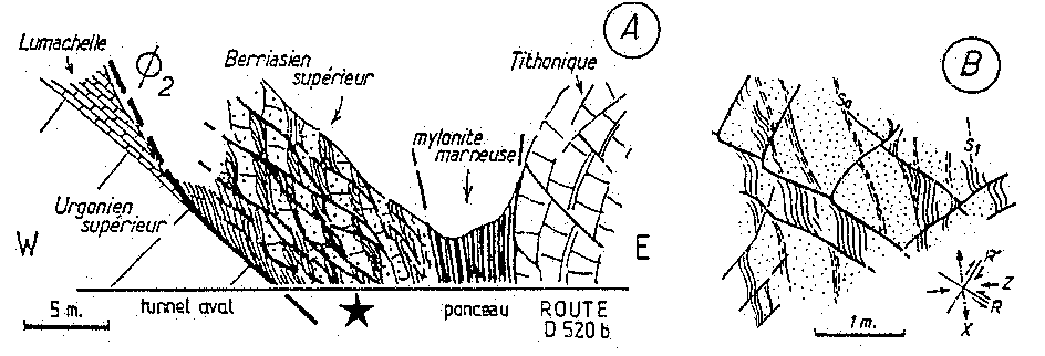 - Enfin, existence d'un pli mineur (décamétrique), très dissymétrique et assez fermé (30°), au contact de l'accident majeur et à la base de la série chevauchante (dans les petits bancs du "Séquanien" inférieur) : il ne représente vraisemblablement qu'un crochon local, lié au cisaillement le long de la faille principale.