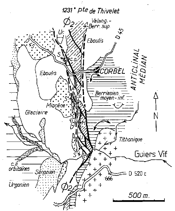 Deux sources de données se complètent pour permettre de préciser la structure dans ce secteur: La cartographie du versant N de la vallée (fig.9 et 10), surtout entre le Guiers et Corbel; l'examen de la coupe dégagée par l'entaille de la route D45 à l'W de Corbel (fig.11).
